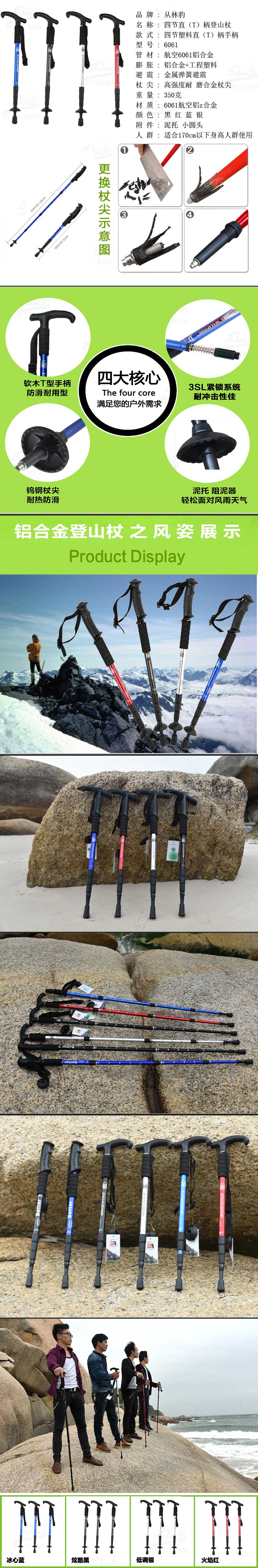 塑料手柄,手感舒適;3SL鎖緊系統(tǒng),有效綬減沖擊;杖身是6060航空鋁合;配置泥托一個適用多種地形;鎢鋼杖尖更強韌、耐磨;EV手柄,具有排濕吸汗功能;