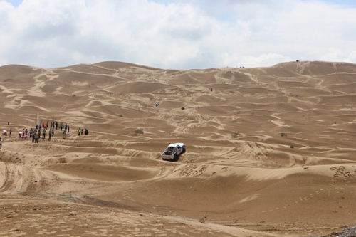 夏日下的沙丘蜿蜒起伏,坡陡溝深,駕駛難度異常之大。但是賽車手們個個藝高膽大,技藝超群,在他們的掌控之下,賽車時而跨越沙脊,時而翻越沙溝,一路爭先。遠遠望去,馳騁在沙丘中的一輛輛賽車,就像是大海中行進的帆船,迎風斬浪。