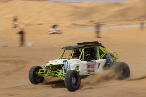 上午10時許,緊張激烈的沙地賽車正式開始。隨著一陣陣劇烈的轟鳴聲,一輛輛參賽車像離弦的箭一樣飛出起點,沖向沙丘。