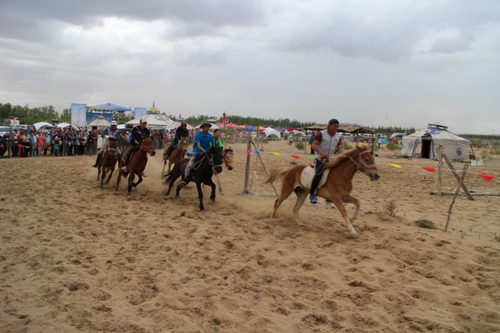 賽馬比賽驚險刺激,十幾匹蒙古駿馬一起奔騰在賽場,蔚為壯觀。令人驚奇的是,參加比賽的不僅有壯年,竟然還有孩子模樣的少年。觀眾最喜歡看的是摔跤比賽。比賽開始后,十幾名選手身著蒙古族摔跤服揮舞著雙臂、跳著鷹舞進入比賽場,兩兩捉對開始比賽。選手體形相差很大,有的選手高大魁梧,有的則顯得較為瘦小。