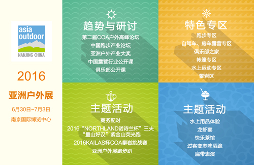 今年,亞洲戶外展匯集650多家戶外用品參展商和品牌,展會規(guī)模4.8萬平方米,是一場屬于戶外品牌、屬于媒體朋友、屬于親愛的專業(yè)觀眾們的戶外盛筵。2016年,亞洲戶外展將有機(jī)結(jié)合靜態(tài)展示、場景體驗、趨勢研討三種展覽形態(tài),實現(xiàn)傳統(tǒng)優(yōu)勢與新興板塊完美嫁接,并匠心策劃一系列聚合品牌、經(jīng)銷商、媒體、俱樂部、賽事組織等優(yōu)勢資源的現(xiàn)場活動。