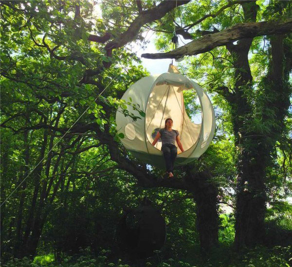 「roomoon」是由 hanging tent company設(shè)計(jì)和制造的球形帳篷,露營者可以將自己懸吊在樹梢上,去體驗(yàn)荒野的樂趣。公司的創(chuàng)始人 rufus martin 認(rèn)為這款帳篷相對(duì)于市場上的其它球形帳篷是便攜的,安裝比較簡單。1.8米寬的底板面能夠卷起來放到汽車后備箱里。鍍鋅的鏈條可以承重1噸,舉升3米,讓用戶有私人的空間,而且也很安全。