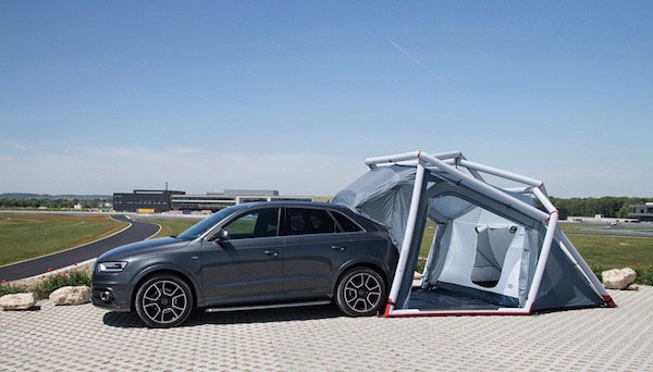來自德國的戶外用品設(shè)計(jì)公司 Heimplanet 為奧迪 Q3 Quattro 開發(fā)了一款充氣野營帳篷,不用時(shí)收納到車頂行李架上,使用時(shí)攤開,只需 7 分鐘即可完成充氣、組裝。這款帳篷用充氣柱子支撐,每根柱子各自獨(dú)立,充氣之后可以和汽車后備箱相連,給司機(jī)和乘客提供一個(gè)更寬敞的休息場所。